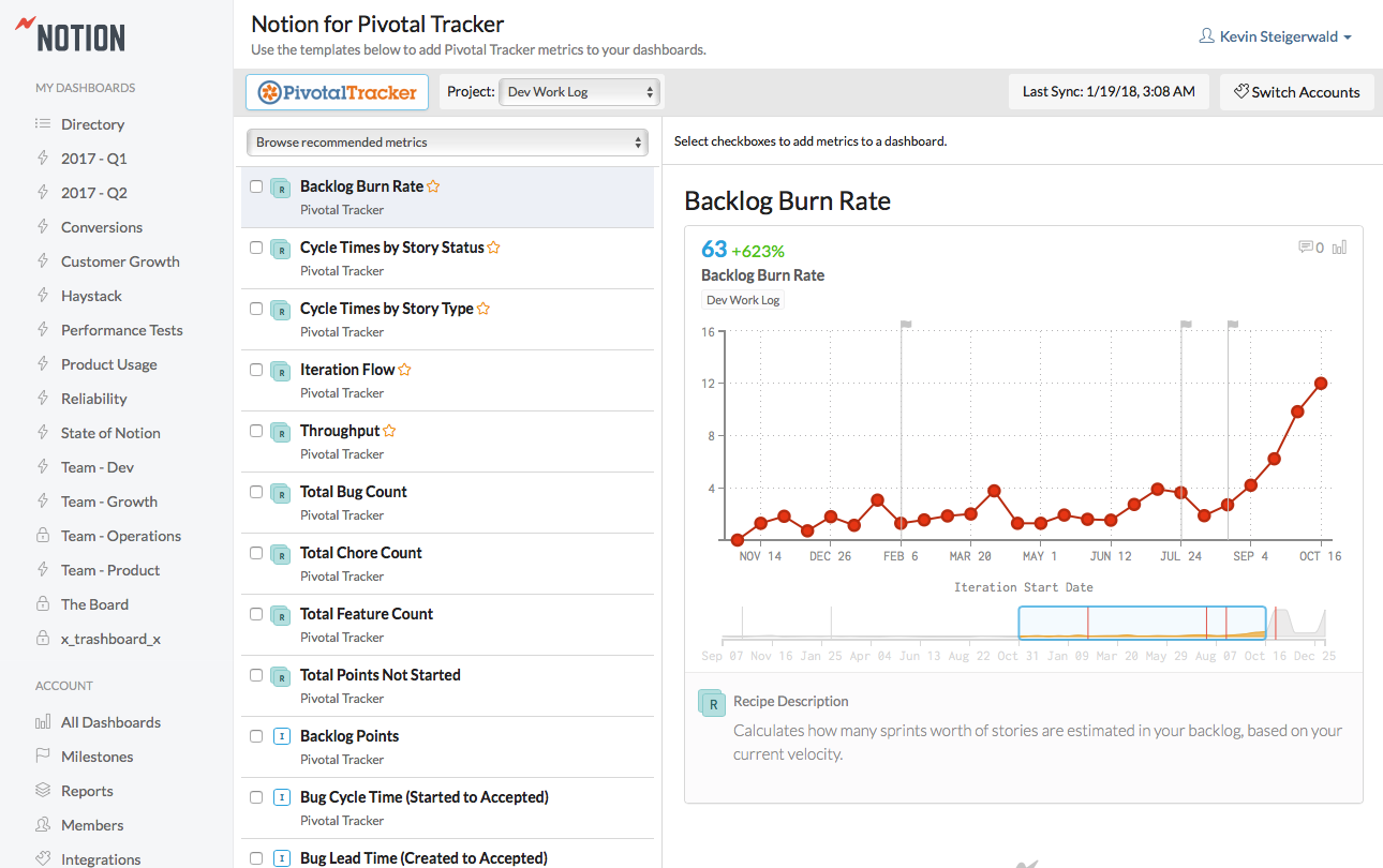 To enable early adopters, we prioritized an onboarding flow that let users build custom metrics or select from a “metric cookbook,” supporting both manual data entry and integrations with tools like Pivotal Tracker. This hybrid approach unlocked immediate value by displaying cross-tool data before we could scale integrations.